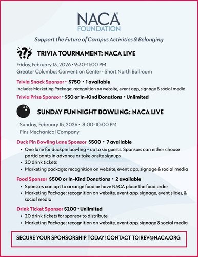 The NACA Foundation has many fundraising initiatives throughout the year in partnership with conferences, events, and programs at both the regional and national level. See all the current fundraising initiatives by clicking the button below: